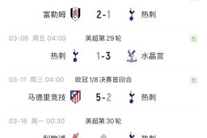 热刺欧冠1/8决赛首回合2-5惨败马竞,下周一周内将连续对阵利物浦、马竞(次回合)、森林。