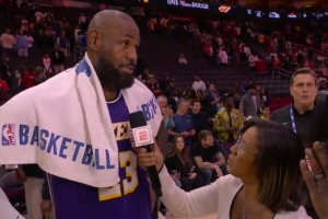 赛后,詹姆斯在场边接受了记者(Lisa Salters)采访。他说道:“我本来要立刻回更衣室冰敷(手肘),但我爱你,你太棒了, 我必须回来接受你的采访。”