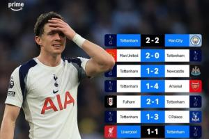 近8场英超联赛中,热刺仅在对阵曼城和利物浦的比赛中拿到分数,其它六场比赛全部输球。
