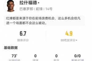 体育资讯4月9日讯 巴萨在本轮欧冠0-2落后马竞,拉什福德本场数据如下: