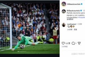 皇马门将库尔图瓦社媒晒出扑救的照片,庆祝球队晋级,配文:“这是一场极其艰难的比赛,但只要我们团结一致,加上你们的支持,我们就是不可战胜的!”
