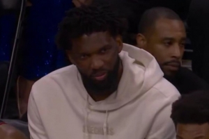 本场因右侧腹斜肌拉伤而缺席比赛的76人核心恩比德,在球队落后时坐在替补席面带笑意。