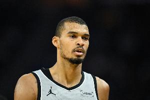 上半场比赛,文班亚马防守端依旧表现出色,护筐稳定;但进攻端始终不在线,一个运动战进球都没有。