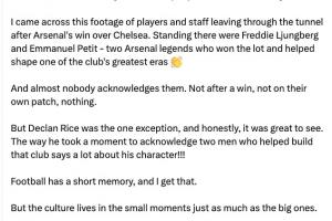 体育资讯03月05日讯 上周末阿森纳在联赛中战胜切尔西,赛后网络上流传出一段视频,枪手众将在返回更衣室时,没有人关注到在球员通道口的两位名宿永贝里和佩蒂特,仅赖斯停下来与两人打了招呼,对此曾在阿森纳青训效力的罗伯逊-卡努发文批评。
