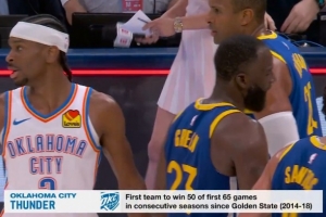 这样一来,雷霆成为自2014-18赛季的金州勇士以来,首个连续两个赛季在前65场比赛中取得至少50胜的球队!